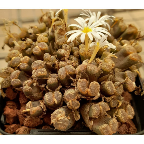 Conophytum pellucidum (Saalsberg). Lovely "butterfly" crosses on the tops of the leaves, just like pellucidum variety terricolor.